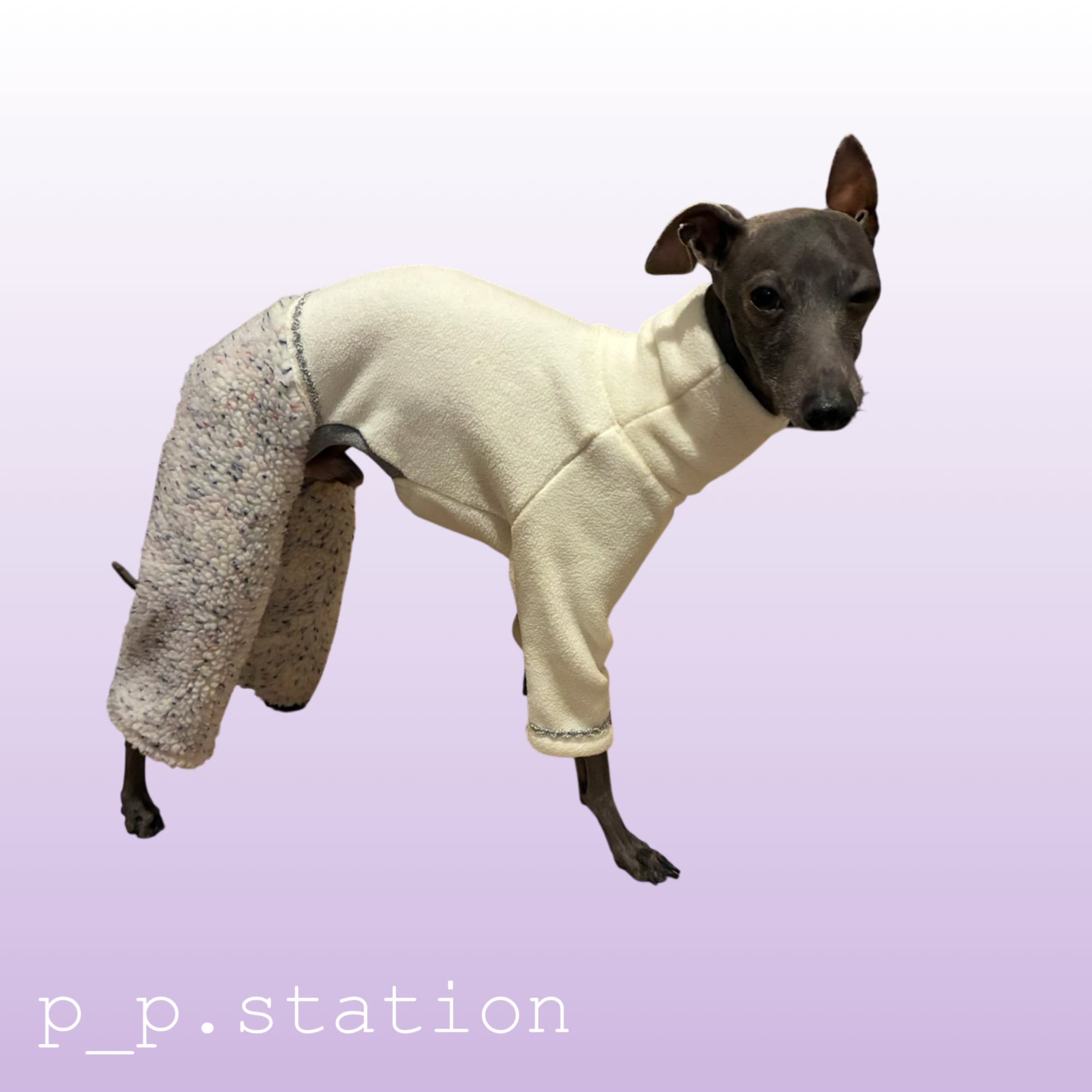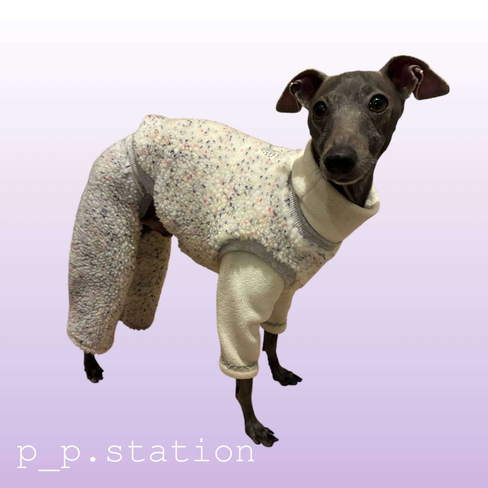 上半身にアンチピリングフリース、パンツにカラフルネップボアを使ったロンパース。
