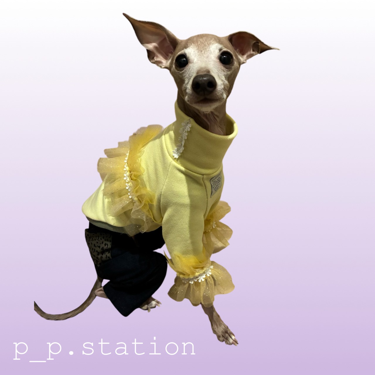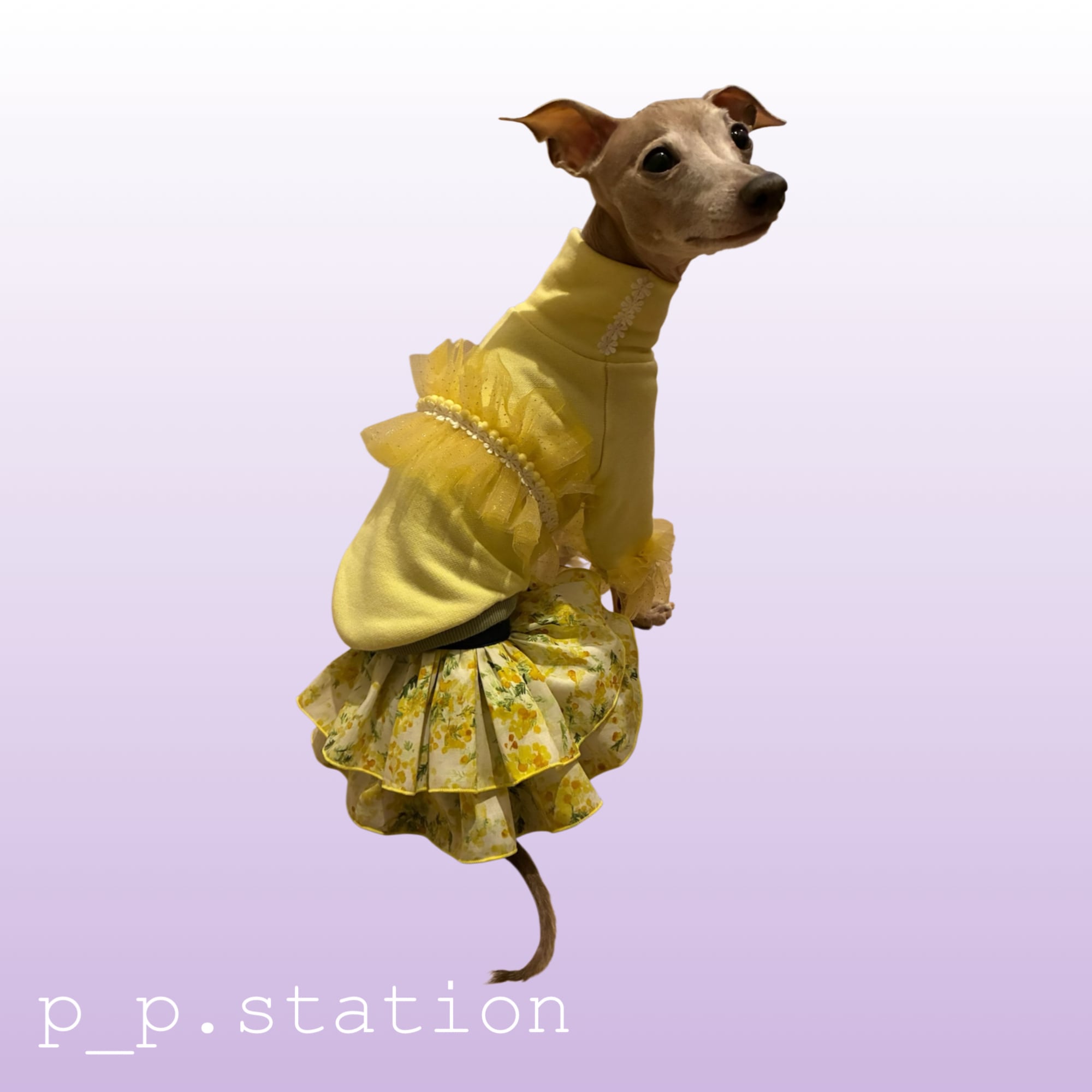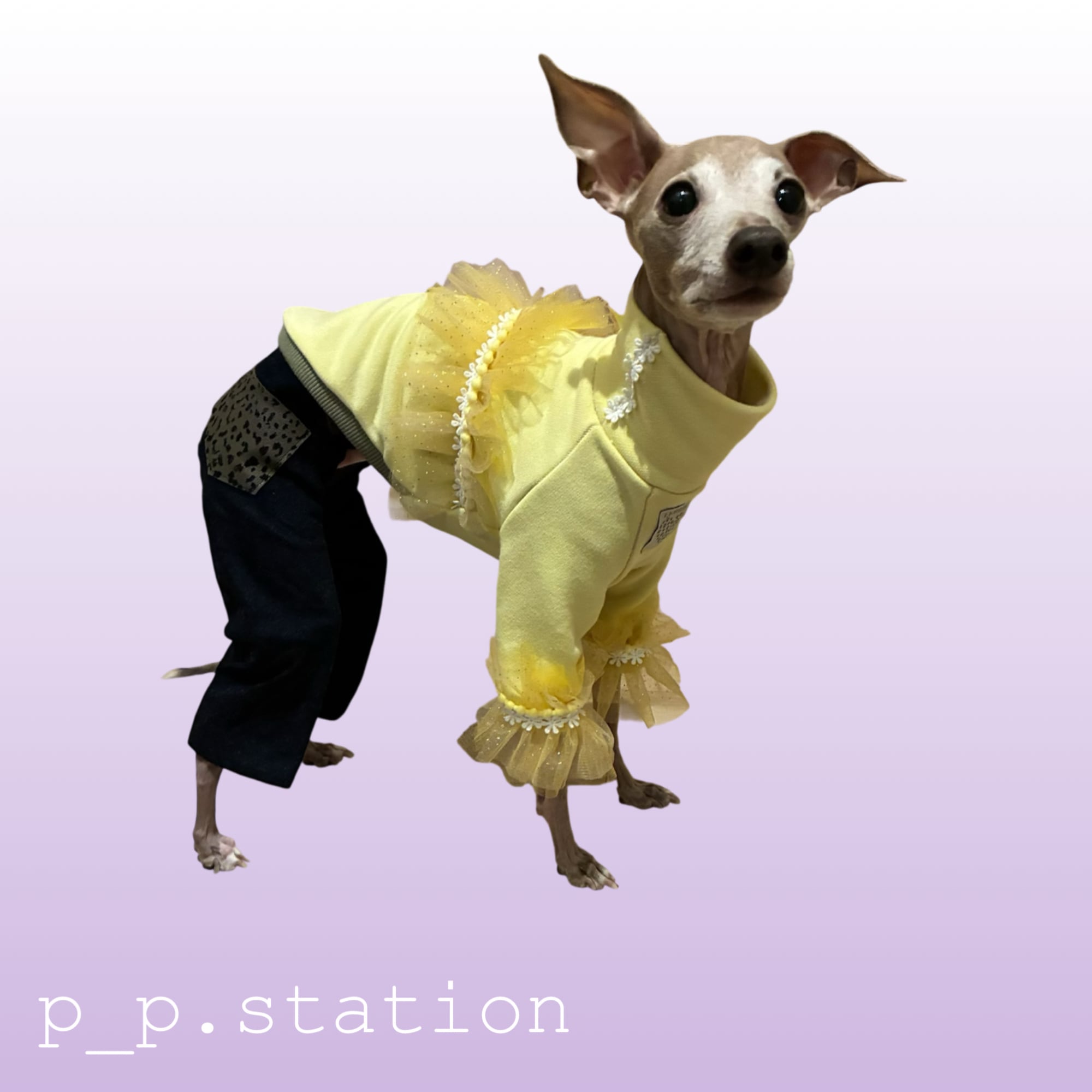 本体は着心地のよい裏毛素材。背中と前脚にふんわりチュールを重ね、ぽんぽんブレードとデイジーブレードで華やかさを添えました。