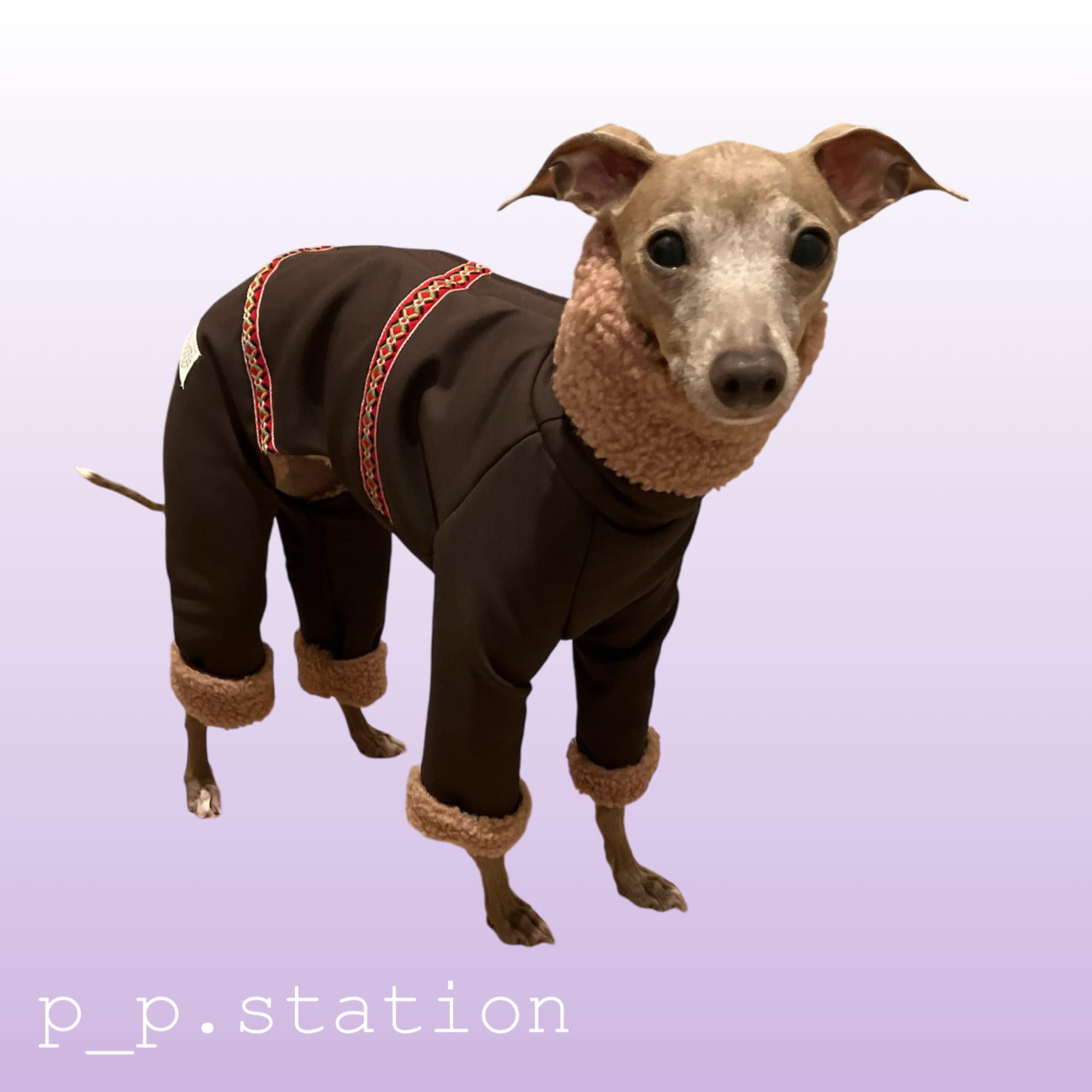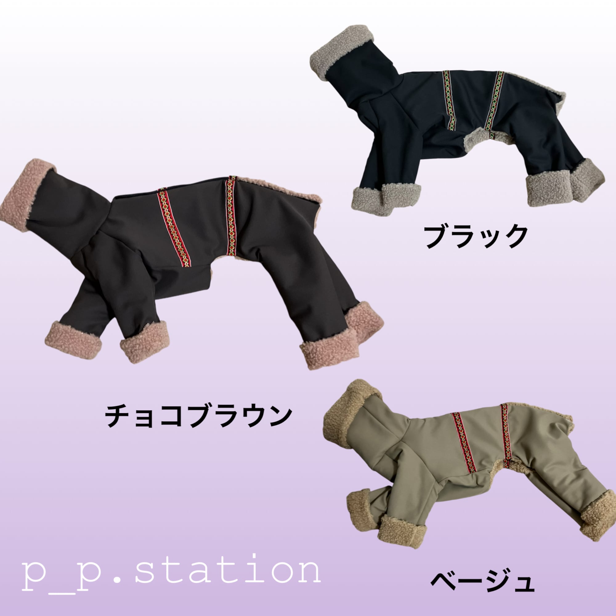 チロリアンテープがポイントの北欧をイメージしたアイテムで首、前脚、後脚全てを折り返してボアを見せても着ることが出来て、機能性だけではなく、可愛らしさも兼ね備えたアイテムです。
