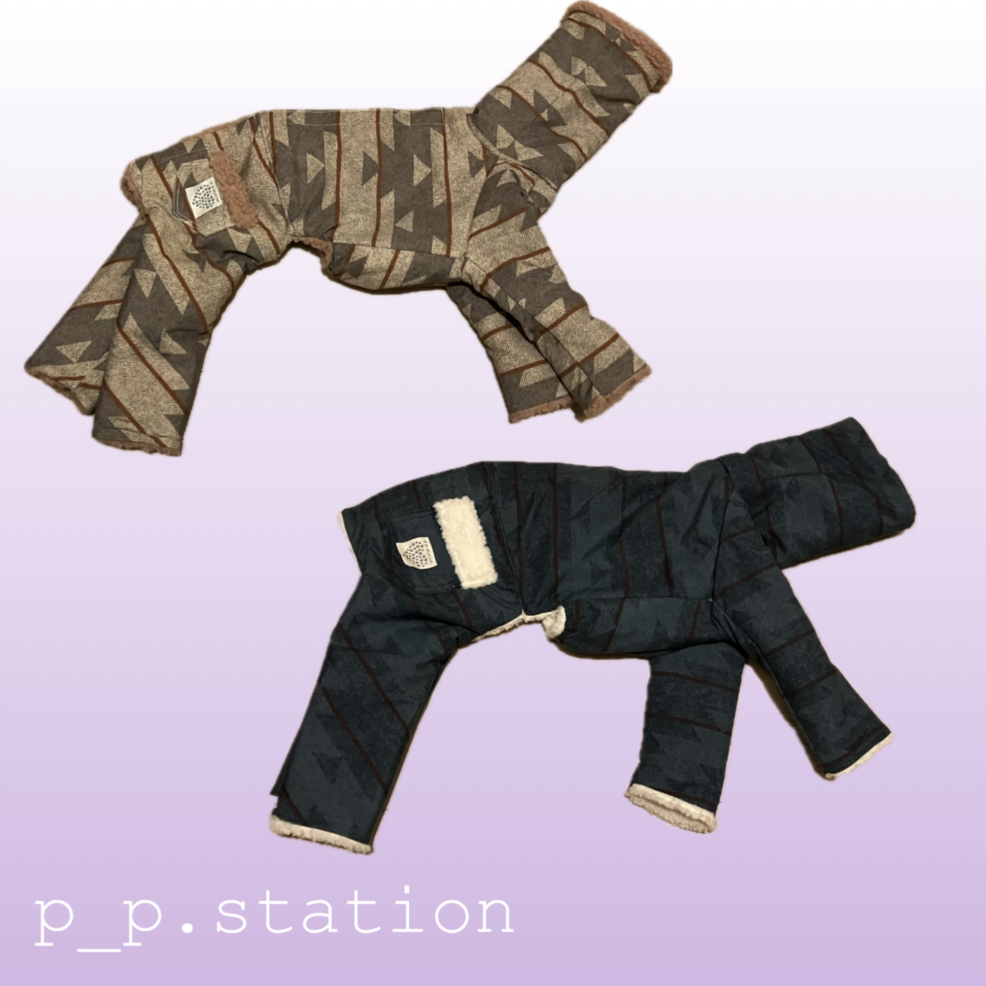 こちらのネイティブ・アメリカン柄をイメージしたアイテムも首、前脚、後脚全てを折り返してボアを見せても着ることが出来て、機能性だけではなく、可愛らしさも兼ね備えたアイテムです。
