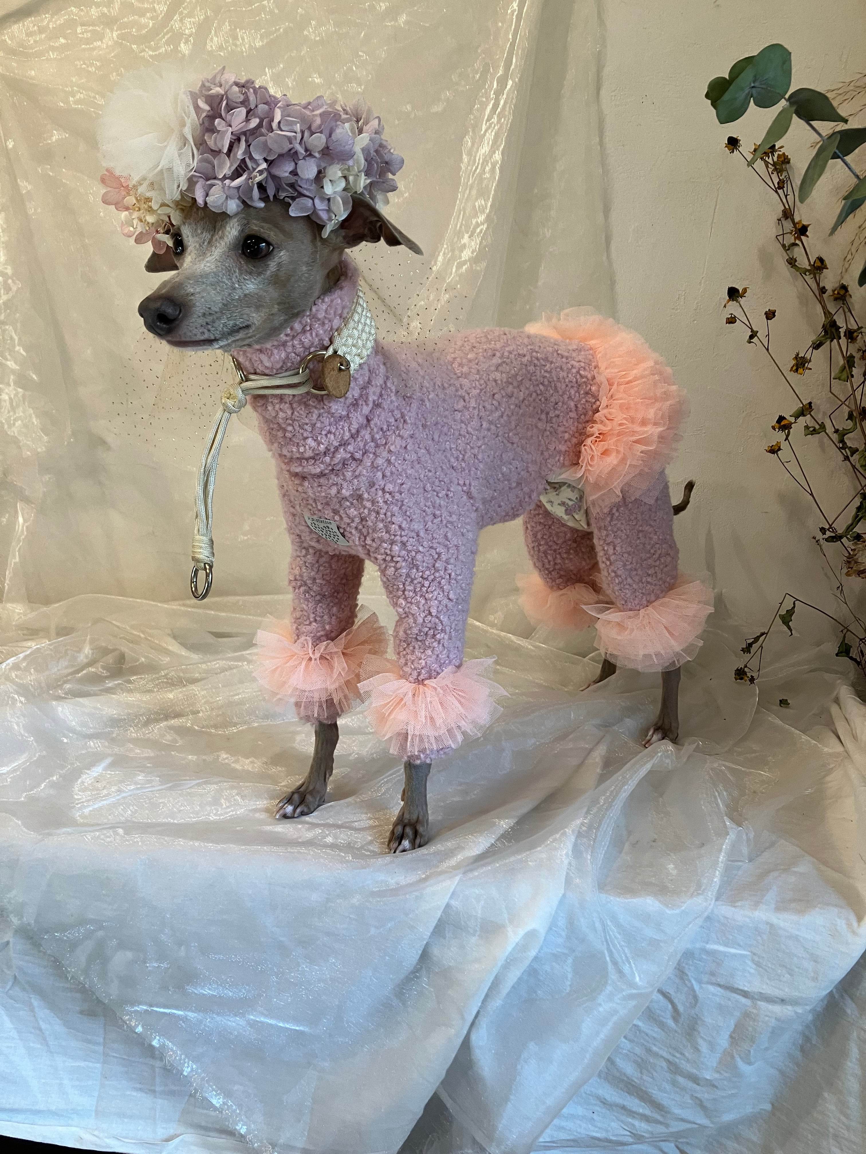 裏起毛の温かいポコポコのボアニット生地にフラワーチュールを取り付けて、ゴージャスにしたロンパース。オプションで前後の脚にチュールも追加できます。